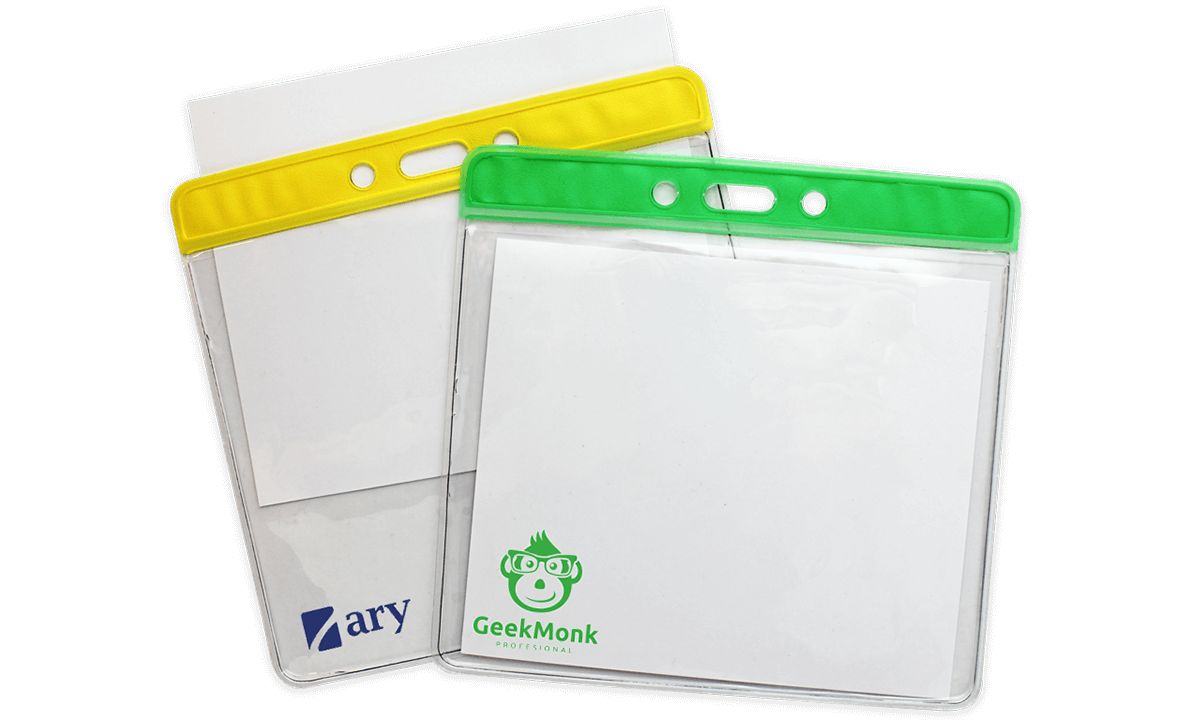 Personnalisez le porte-badge à votre image ! Pochette en vinyle transparent avec barre de couleur supérieure, une perforations oblongue et deux circulaires pour les chaînettes.